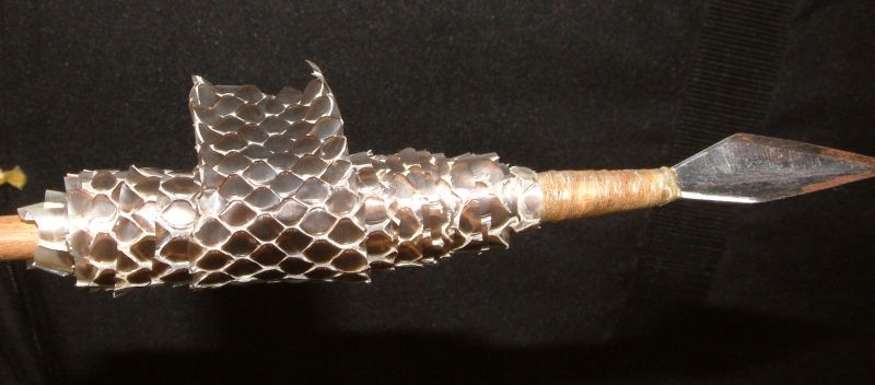 Der nachfolgend abgebildete Bogen ist aus Manau. Hier hat das Natternhemd (auf Mahagoniebeize) erst gut gehalten, aber das Manau hat im täglichen Schießbetrieb derart Falten erzeugt, dass die Oberfläche dann unansehnlich wurde. Fazit: Lieber auf richtigem Holz, vorzugsweise auf wenig biegenden Langbogen.