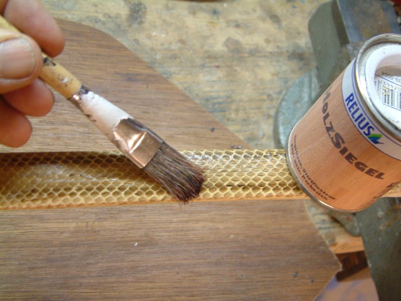 Bevor jetzt die Fragen kommen, ob man auch ölen oder wachsen kann, hier die Antwort: Es geht nicht um das Konservieren gegen Feuchtigkeit, sondern es geht hier um das Stabilisieren der fragilen Haut. Mit einigen Lackschichten eines Fußbodensiegellacks erhalte ich eine hornharte Oberfläche, die sich nicht mehr so leicht lösen läßt.