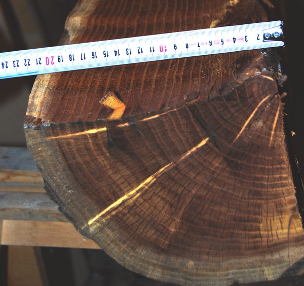 Im Zuge meiner Holzeinkäufe ist es mir gelungen einem bogenbauenden Sägewerksbesitzer, der einen gewaltigen Osage Stamm (45cm Durchmesser) selbst aus Ungarn geholt hat, einen Viertelstamm davon abzuschwatzen. Das sind also so geschätzte 80kg Holz die sich auf 2m Länge bei einem Radius von gut 20cm und über die Stammbiegung gemessen einer Breite von knapp 40cm verteilen. Er hat 4 Splintringe die ich nun begonnen habe mit dem Stechbeitel Ring für Ring zu entfernen (bin immer noch beim ersten Ring, bei 40cm Breite auf 2m Länge ist auch ein Ring viel Holz und das Zeug ist ja höllisch hart und spröde. Aber bei dieser Arbeit kann ich mich gleich mal mit Faserverlauf und anderen Eigenschaften von dem "Stöckchen" vertraut machen. Das gute Stück dürfte vor ca. 5 Jahren geschlagen worden sein).