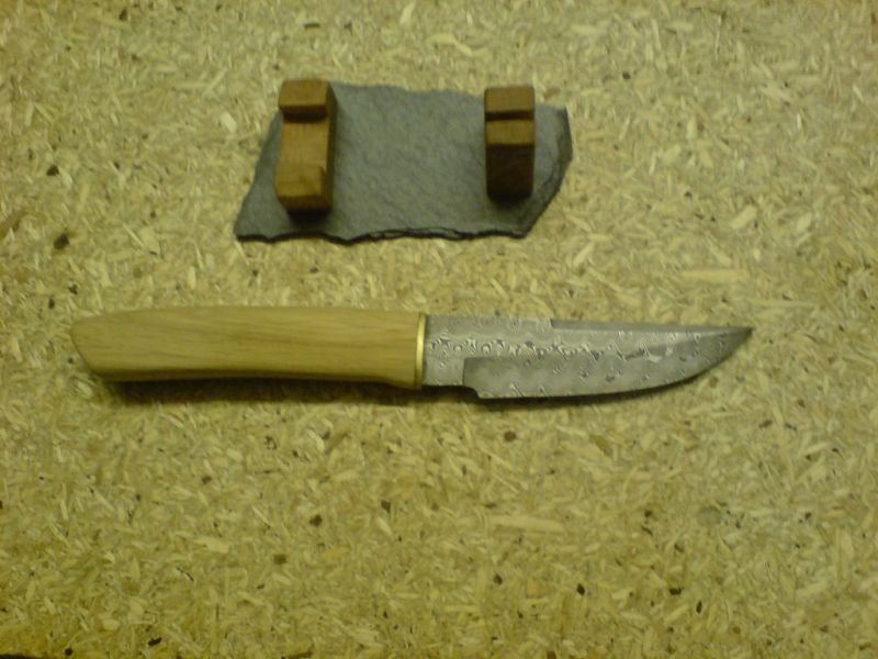 Da ich keine Lust mehr hatte , eine Lederscheide zu machen, hab ich eine Schiefer vom Dach genommen und aus einem mir unbekannten Holz die Halterung gesägt und drauf geklebt.