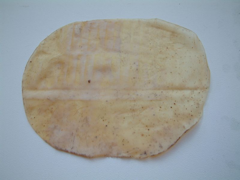Alternativ kann man auch fertige Rohhaut kaufen. Dabei sollte man auf gleichmäßige Stärke der Haut an allen Stellen achten.