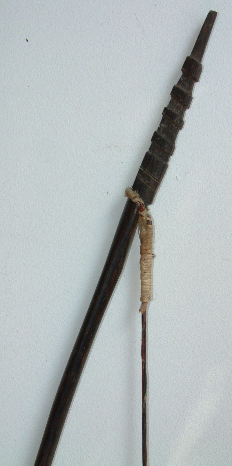 An einem Ende der Sehne hatte ich ja schon eine Schlaufe eingearbeitet. Nun muss die Sehne an den Bogen angepaßt werden und die zweite Schlaufe erstellt werden. Für einen Bogenbauerknoten ist das Material zu steif, daher habe ich das untere Ende in einer Länge von 12 cm nochmals über Nacht in Wasser eingeweicht und dann das Öhrchen eingespleißt/ eingeflochten.