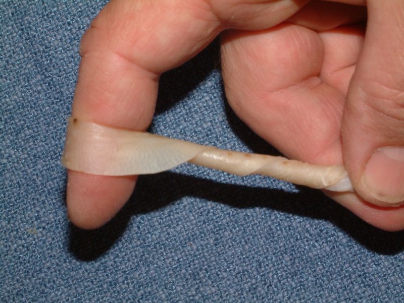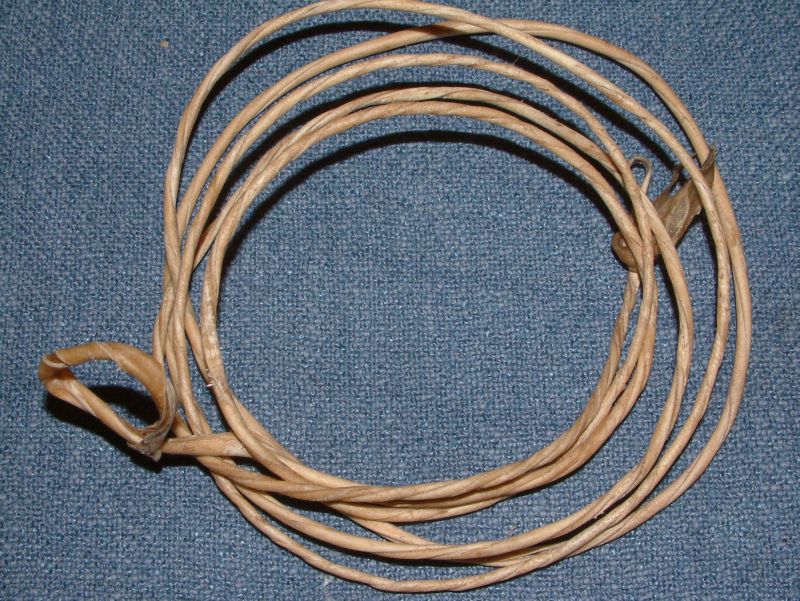 Eine Sehne läßt sich relativ einfach und schnell aus Rohhaut herstellen. Diese Sehne hat eine erstaunliche Reißfestigkeit. Ich habe die fertige Sehne über eine Reckstange gelegt und mit 70 kg (= 154 lb) belastet. Das hat sie locker weggesteckt.
