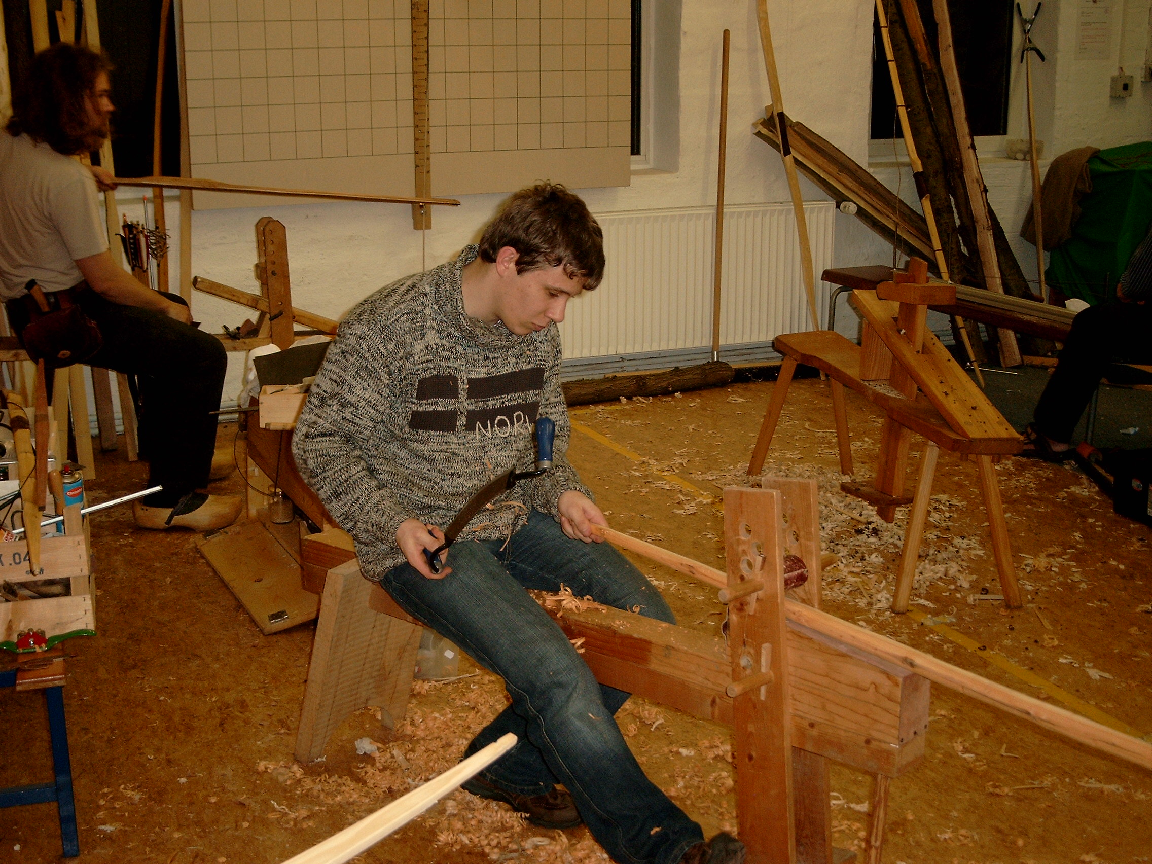 Nach dem ausgiebigen Frühstück beschäftigten sich die meisten mit ihren Bogenbau-Projekten, zu denen es noch einige Bidler geben wird.