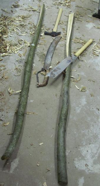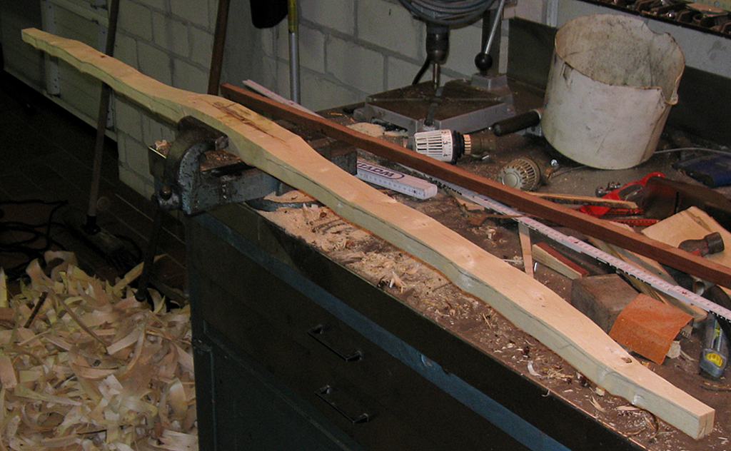 Achja der Stamm hat einen Durchmesser von 10cm Nachdem der Stave gespalten war, gings auch gleich daran, ihn zu vermessen, eine Mittellinie anzuzeichnen und erstmal die grobe Form auszuarbeiten