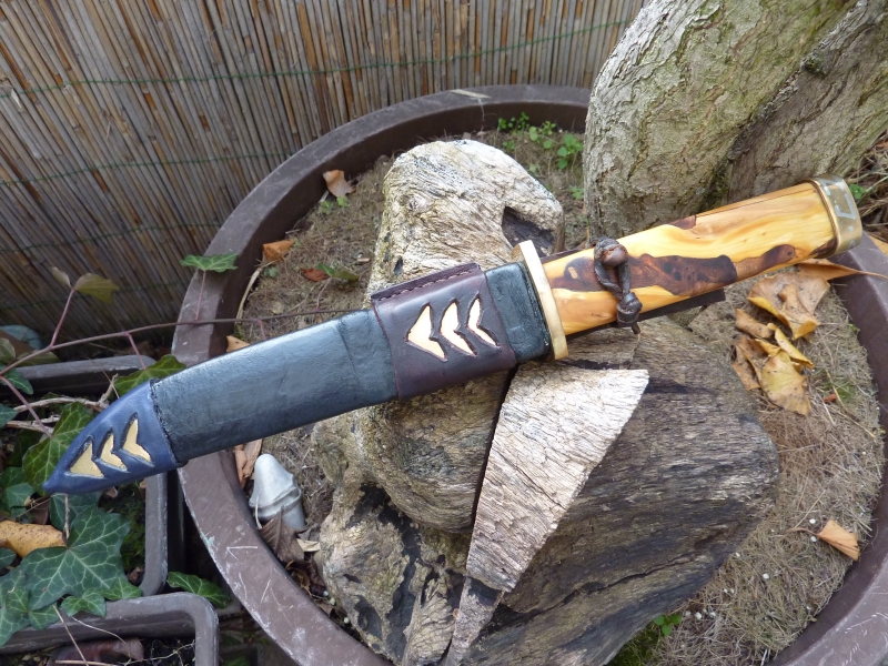 Nach dem Motto "Ein Messer ist erst fertig wenn auch die Scheide fertig ist" mal ein Bild zu meinem schon vor fast einem Jahr vorgestellten Dolch der jetzt endlich eine Behausung gekriegt hat, sowie zwei Bilder von meinem neuesten Werk.