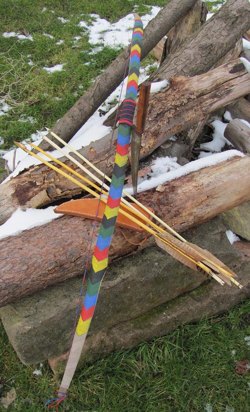 "Zuzueca" soll wohl "gestreifte Schlange" bedeuten. Ich glaubte es dem Netz mal und hab freihand den Bogenrücken mit einem Streifenmuster bemalt. Herkömliche Abtönfarbe. Dazu bekam er noch ne drei-farbig gespleißte Sehne und, da ja die gesamte Schlange biegt, nen einfaches, dünnes Griffleder mit ner Zierwicklung aus Maurerschnur.