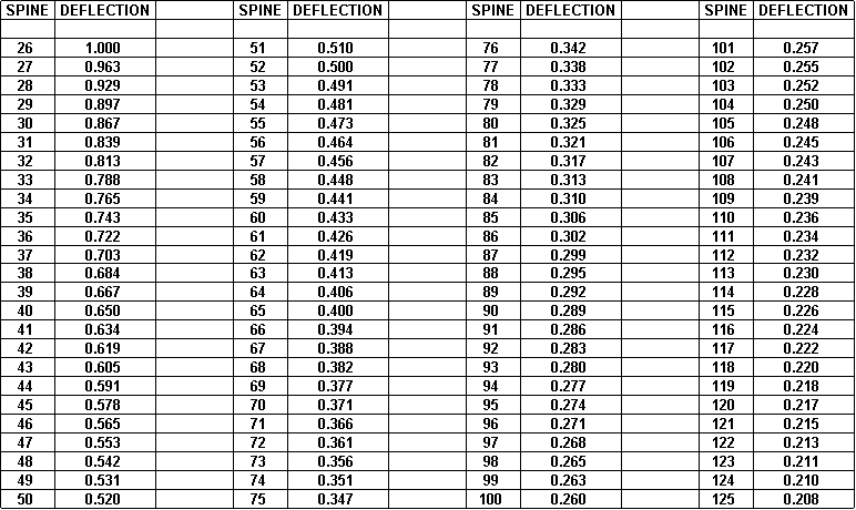 Das ist die Tabelle für den Holzspine. ;) Sie gibt nur die Durchbiegung der Holzpfeile bei 26" und 2# Gewicht an. ;D