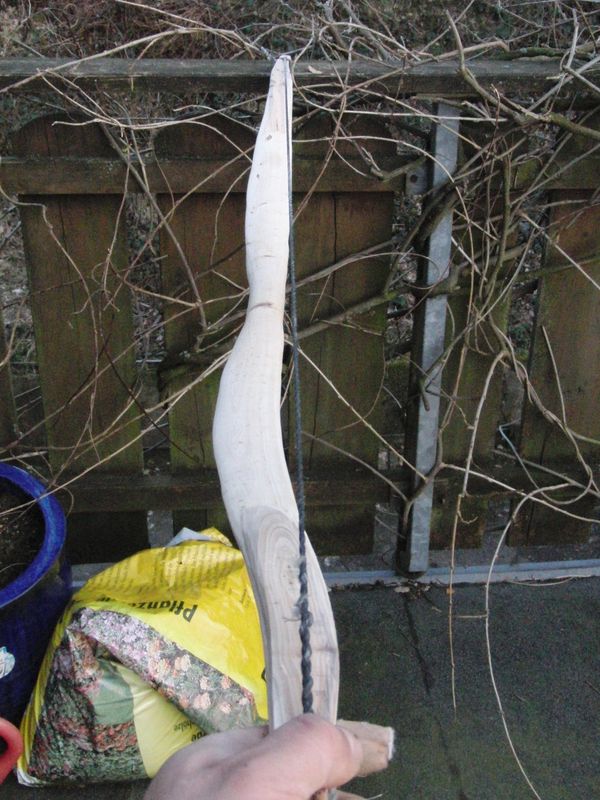 Der Bogen hatte sich beim trocknen C-förmig seitl. verzogen, habe den Griff gedämpft und dann am WA nochmal mit der HLP nachgerichtet. Das Holz ist total elastisch und hat die Form nicht ganz angenommen, habe den Sehnenverlauf also nicht richtig hin bekommen.