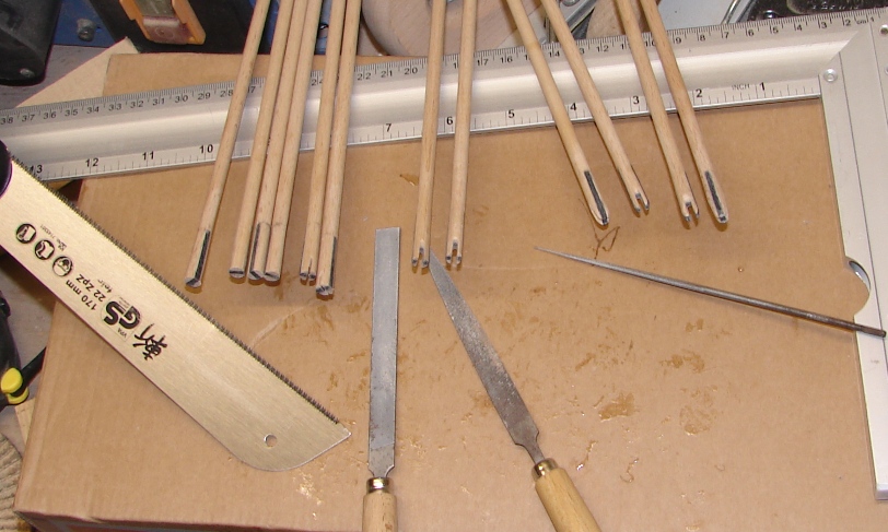 Ich mache meine Nockverstärkungen meist mit der Bandsäge, manchmal auch mit einer auf den Rücken eingespannten Stichsäge. Ich kann aber auch per Hand sägen, da nehme ich dann eine Feinsäge oder Japansäge, sonst verläuft mir der Sägeschnitt auch!
