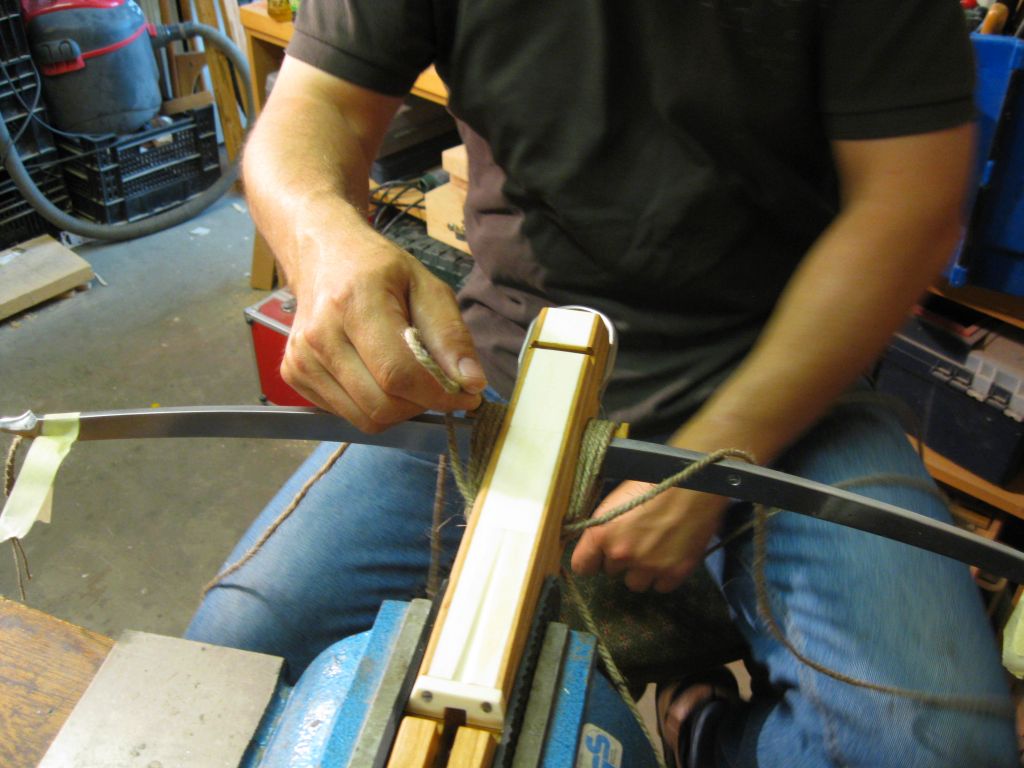 Die Säule ist geschliffen, der Bogen eingebaut, die Sehne ist auch schon drauf.