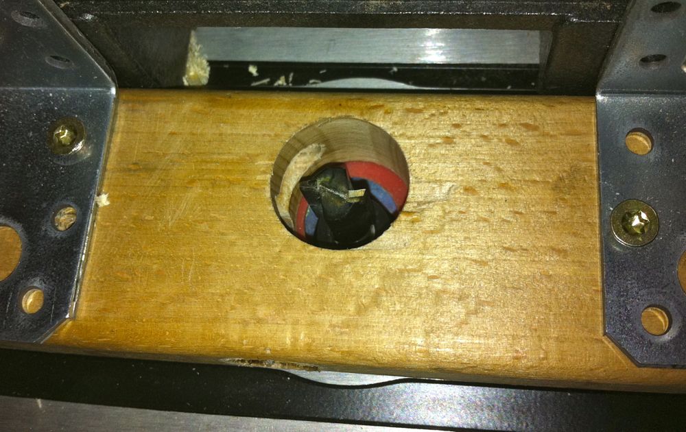 Der Rest ist eigentlich simpel. Ein Stück Buchenholz mit 20mm bis zur Mitte vorgebohrt und mit 9mm durchgebohrt. Im 90 Grad Winkel dazu ein 25mm Loch für den Fräser. Zwei Winkel und zwei Schrauben zur fixierung und feineinstellung und fertig ist das Ding.