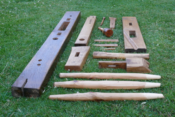 Sie besteht komplett aus Holz und hat nur Keil- und Steckverbindungen, die sich mit die sich mit dem (beiliegenden) Holzklüpfel lösen bzw. fixieren lassen.