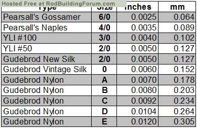 die seidenfäden sind einiges feiner als die aus nylon, im netz ist irgendwo eine vergleichstabelle. wenn ich sie finde, werde ich sie zur verfügung stellen.