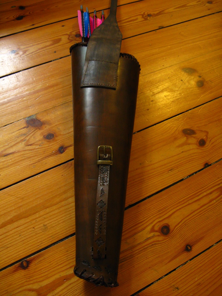 vor ein paar Tagen habe ich einen Köcher aus Leder gebastelt - hier sind einige Bilder davon. Er ist sicher nicht perfekt (vor allem die Färbung muss ich nochmal üben), aber dafür ist es ja ein erster Versuch.