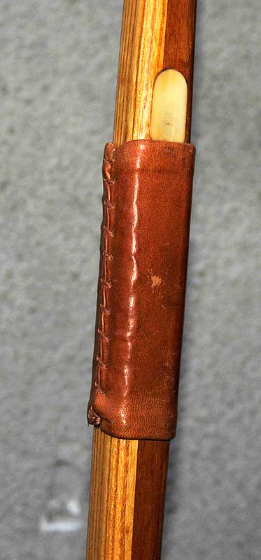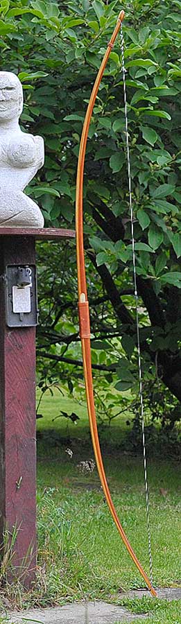 Mein erster und bisher einiger Selbstgebauter ist ein simpler Eschenbogen mit Ledergriff, 1,95m lang mit 45#@29". Das Ding ist eine undefinierbare Zwischenform aus Lang- und Flachbogen (eher Letzteres), den ich vor 2 oder 3 Jahren in 'nem Kurs gebaut habe. Hat zwar 'n paar Stauchrisse am Bauch, schießt aber recht flott.