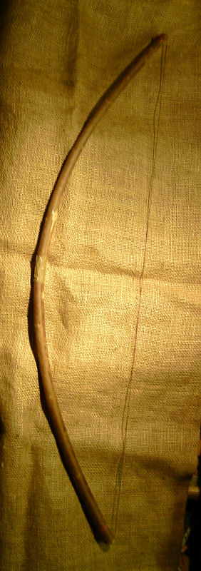 1. erfolgreicher Bogen: Hasel aus Sapling. Schießt noch heute und hat sogar nachträglich an Wums zugelegt, da er noch etwas feucht hinter den Ohren war.