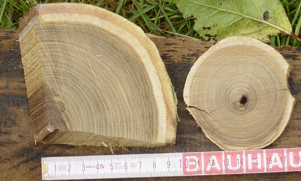 das erspart mir frust. Hab meinen Goldregen jetzt von der Rinde befreit. Und siehe da, in der Mitte des Stammes, dort wo die Trocknung am langsamsten ist, ist der Splint ergraut und von einem (Schimmel?)Pilz befallen.