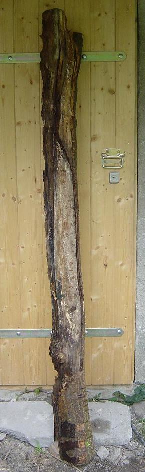 Einerseits wird geraten das Holz in der Rinde zu trocken, andererseits soll die Rinde ab, damit das Splintholz nicht vergraut. Wann ist denn ein guter Zeitpunkt zum Entrinden? Das Holz lag unbestimmte Zeit im Freien auf einem Müllholzstapel, bevor ich es sicherstellen konnte. Die Rinde ist noch sehr feucht, das Kernholz ist an den Schnittstellen leicht angerissen. Fast das ganze Holz hat Kernfäule, aber es bleibt wohl genug für einen Bogen übrig. Ansonsten habe ich Holz für wirklich sehr viele Messergriffe und Vorschäfte, wenn es partout kein Bogen werden will.
