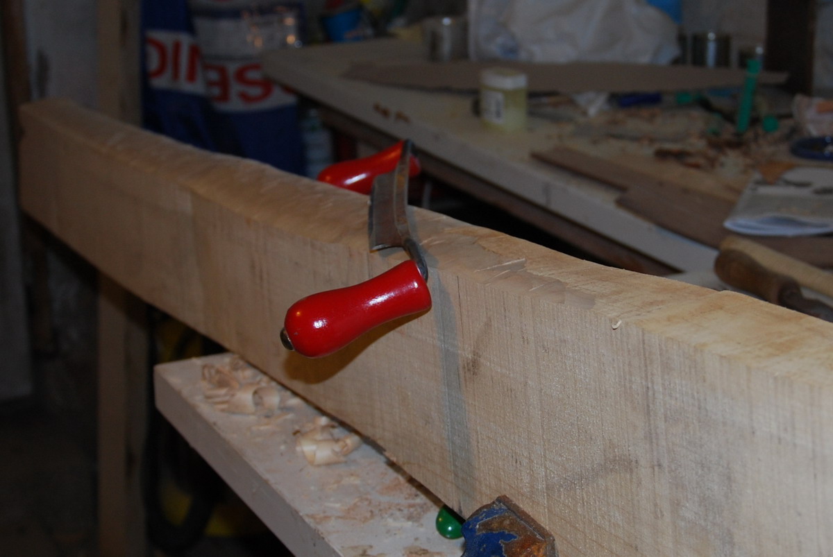 Ahornpfosten (Pfosten = österr. für Bohle) fest gemacht, Ziehmesser noch schnell geschliffen und mal runter bis vor den gewünschten Ring.