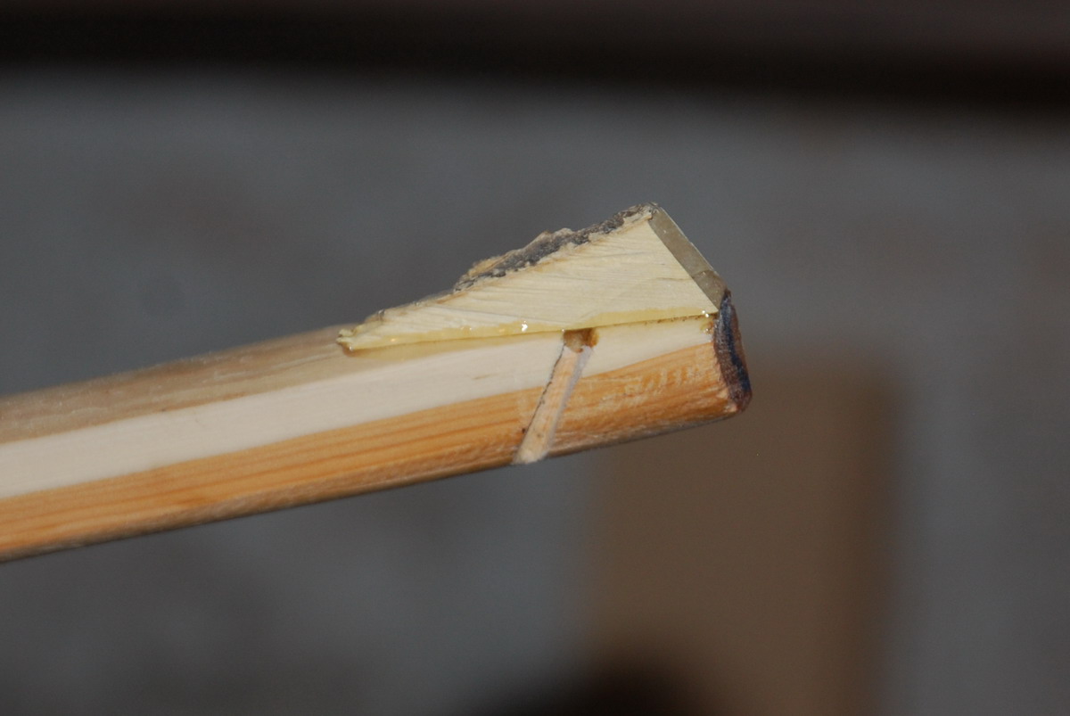 Vom nächsten Schritt hab ich leider keine Fotos. Ich hab die Sehne stark verkürzt und mal den Knüppel in der Hand ein paar Zoll aufgezogen , wie ich erwartet habe ich einen Drehimpuls gegen den Uhrzeigersinn gespürt, deshalb hab ich die Tips auf beiden Seiten links um die Hälfte reduziert, um die Sehne nach rechts zu verlagern, dabei sind natürlich die provisorischen Nocks einseitig verloren gegangen. Ein neuerlicher Aufspannversuch mit den jetzt einseitigen provisorischen Nocks zeigt den Erfolg der Aktion der Drehimpuls ist sogut wie weg, der Rest geht mit dem Tiller. Nach der Aktion waren die Tips nur noch 6mm breit, provisorische Nocks auf der linken Seite nachsägen geht sich da nicht aus, deshalb erst mal Overlays drauf.