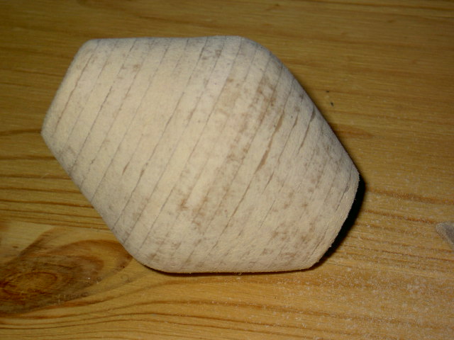 Abb.1: Nur mit Bohrständer und Bohrmaschine gebaute Heulboje aus Ahornholz, verschliffen und poliert, 60 x 30 mm. Borhrungen fehlen noch. Gewicht 10 g, ganzer Pfeil 40 g