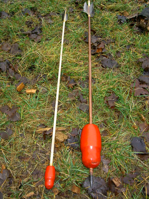 Nicht zu unterschätzen ist die Geschwindigkeit des Pfeiles. Meine Mini-Troschka gibt einen ganz gemeinen hellen Ton von sich, der mir gar nicht gefällt. Einmal ist der Korpus viel kleiner, und dann habe ich auch die Federn sehr kurz und tief gemacht. Da muss ich noch was ändern, damit der Pfeil langsamer fliegt. Hier sieht man mal die Größenunterschiede. Die kleine Flöte ist sechs Zentimeter lang.