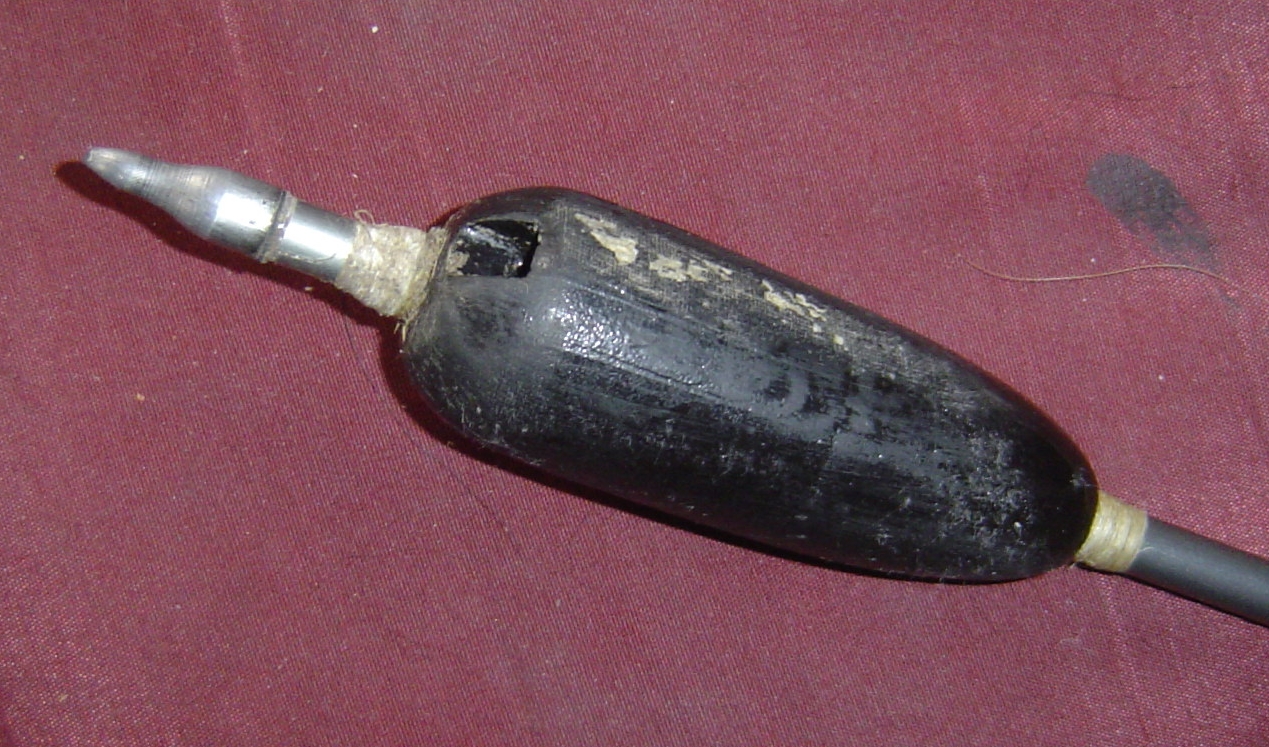 Hier mal das Ausgangsmaterial: Dann öffnete ich sukkzessive das Loch und lernte dabei eine Menge, was geht und was nicht. Irgendwann sah es so aus: Ich war dann ganz zufrieden mit dem Ton und schoss diesen Pfeil erst eine Weile später. Und...? Ton wieder weg. Ich wollte da schon echt an mir zweifeln, bis ich mal drauf achtete, wie ich die Flöte positionierte auf dem Bogen. Siehe da: Ein Loch ist schlecht. Die Flöte flötet nur, wenn das Loch nach unten zeigt. Also werde ich dem Teil eine zweite Öffnung spendieren.