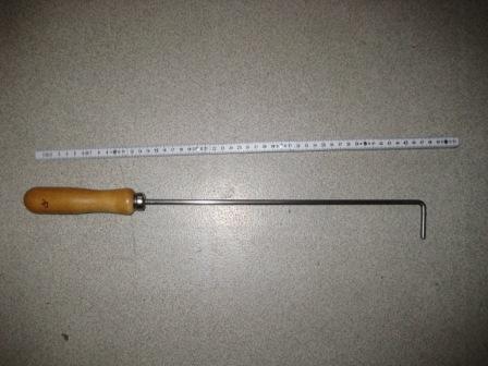 Selbst bei 4 oder 5 mm Rundstahl verbiegt sich nicht mehr. Man darf halt keinen Eisendraht nehmen. Beim Schlosser mal nachfragen nach einem Stück 60 cm - 80 cm, je nach Körpergrösse, das dann 5 cm am Ende 90 Grad abwinkeln lassen ( sofern mans nicht selbst kann ), im Baumarkt einen Feilgriff kaufen ( Centkram ), aufbohren aufs nötige Mass, das Metallgeraffel am Ende 6-8 cm mit dem Schleifstein, Feile oder Bandschleifer "zerkratzen" und mit Epoxy in den Griff einkleben.