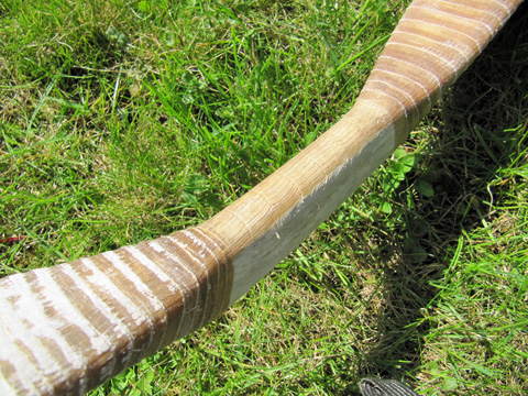 · als erstes wurden 3 Teilstücke für den Griff und für die Siyahs aufgeleimt und dann komplett circa 10m Rohhautstreifen in 1,5cm Breite um die ganzen Wa´s, welche sich circa 5-6mm überlappen