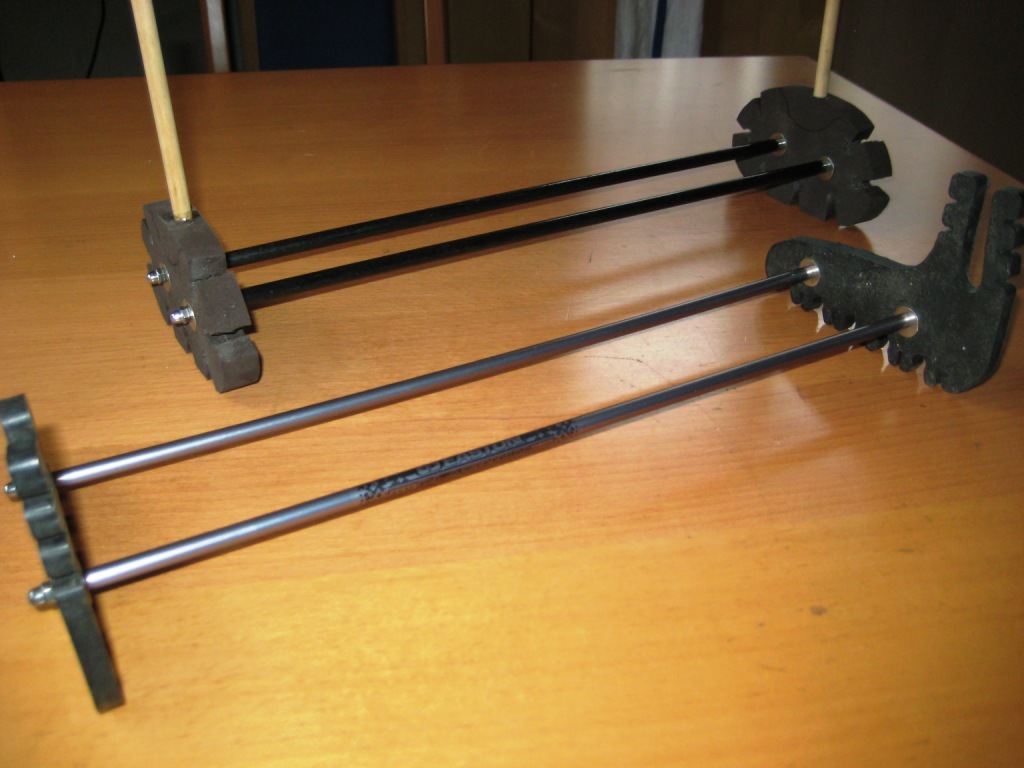 Die Abstandshalter bestehen aus Gewindestäben M4, einmal ( Hartgummi ) überzogen mit einem alten Alupfeil, beim anderen ( Schaumstoff ) mit Carbonrohr aus dem Drachenbau.