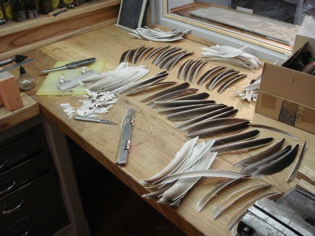 Diesmal hab ich die Kiele ausgebrannt anstatt zu schleifen - da werden die Federn gerader. Ist oft besser wenn die Federlänge nicht so üppig ist.