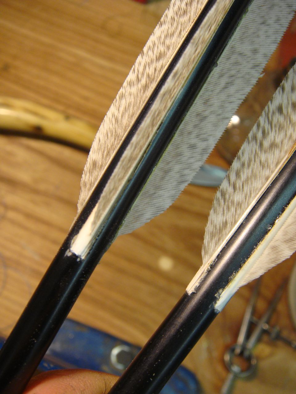 Die Pfeile, die ich von Gervase geschenkt bekommen habe, hatten zu Anfang die Nock europäisch aufsitzen. Nachdem ich eine Weile mit den Pfeilen geschossen hatte ging es mir ziemlich auf den Keks, dass ich mir dabei die Leitfeder platt drückte. Also habe ich die Nocks runter gemacht und neue, mit der Leitfeder nach oben, drauf geklebt.