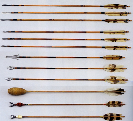 Zu Makiwarapfeilen mit Federn sei gesagt, dass ein Satz Makiwarapfeile für die Makiwara-Zeremonie aus zwei befiederten Pfeilen besteht, die von der Qualität her nichts mit den "normalen" Makiwarapfeilen zu tun haben. Sie sind befiedert, meist mit weißen Federn, und haben Nocken und Spitzen aus Horn oder Elfenbein. Es werden immer die ungeschnittenen äußeren Schwingenfedern verwendet. Warum? Keine Ahnung. So ein Pfeil kann leicht mehr als hundert Euronen kosten.