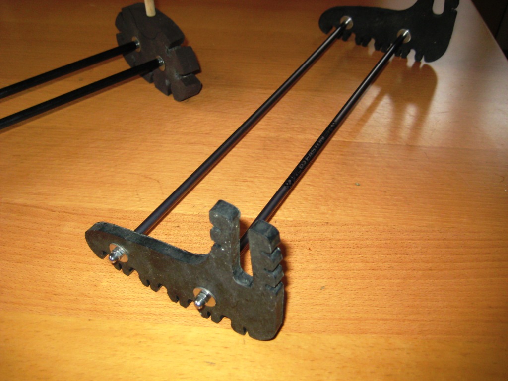 Die Abstandshalter bestehen aus Gewindestäben M4, einmal ( Hartgummi ) überzogen mit einem alten Alupfeil, beim anderen ( Schaumstoff ) mit Carbonrohr aus dem Drachenbau.