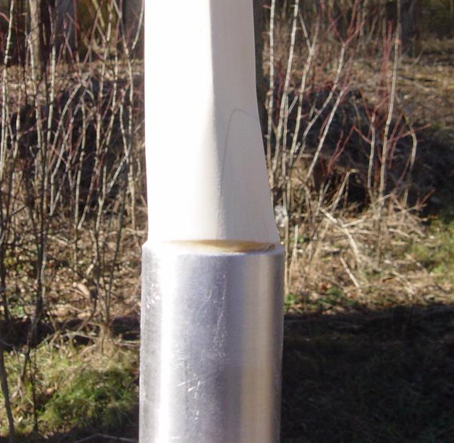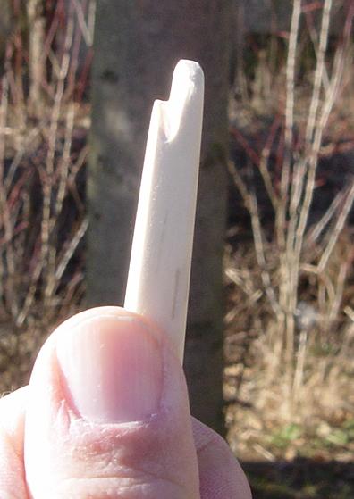 Die Nocke wird gerade oben ein wenig angespitzt. Die Sehnenöhrchen mache ich bei einseiteiger Nockkerbe immer so klein wie möglich, damit die Sehne nicht so leicht abrutscht. Deshalb Spitze ich die Nocke oben ein wenig an, damit das kleine Öhrchen gut über die Nocke rutscht.