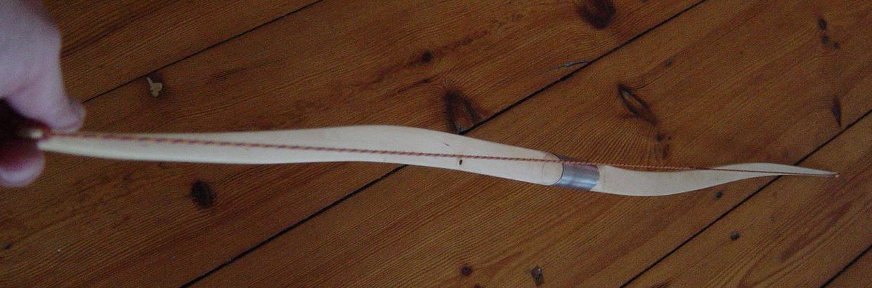 Hier die Sehnenlage, nicht ganz mittig, aber die WA sind dann auch nicht ganz so verdreht. Außerdem muss sich der Pfeil jetzt nicht ganz so weit um den Bogen schlängeln.