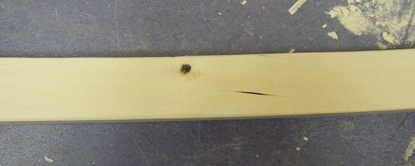 Im Chat kam die Frage auf, ob die beiden Knicke zu vermeiden gewesen wären? Nein. Ganz plötzlich bekam das eine Ende Dauerbiegung und der Jahresring schält sich ab. Da war eine alte, schlecht verheilte Rindenverletzung, die vorher nicht sichtbar war. Da konnte ich nur noch die Schwachstelle entlasten, in dem ich den restlichen Bogen komplett etwas dünner schabte. Dabei tat sich unangekündigt die nächst schwachstelle auf. Aus einem guten, festen Totast, wurde in 3 Strichen mit der Ziehklinge eine weiche Matschestelle.