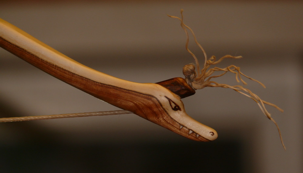 Vollauszugaufgespannt..und entspanntDetails: oberer Nock, Drachenzähne aus Rinderknochen.. von der anderen SeiteGriff hat einen Riss bis zum Markkanal - das muss man doch irgendwie nutzen...Bauch..und Rückenansicht das wars zu DRAGONOK ;ich hoffe es fehlt nix