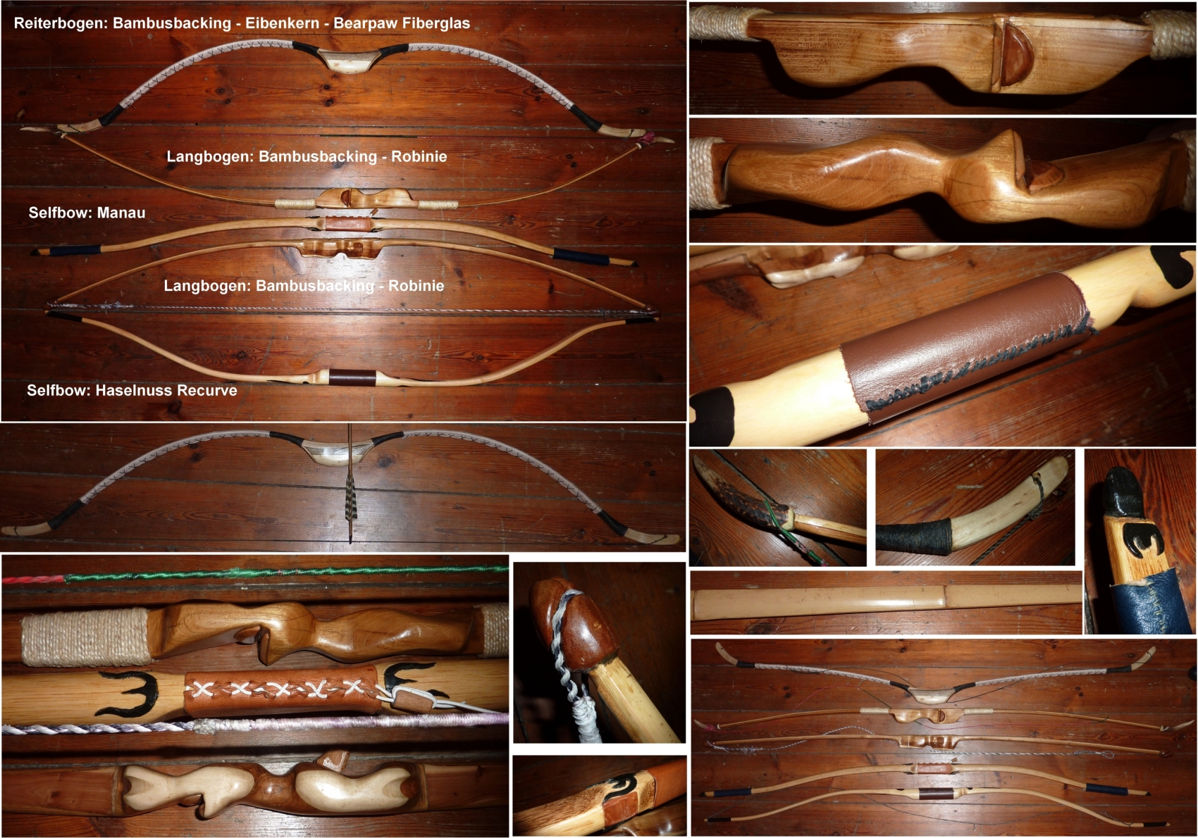 das ist meine Sammlung aller Bögen, die ich in den letzten paar Jahren gebastelt habe. Den Reiterbogen kennen manche vielleicht schon. Der Bambus-Robinien-Bogen mit der Wicklung ist noch mit Schlangenhaut belegt (dafür musste keine Schlange sterben!), leider habe ich aber verpeilt ein Bild vom Backing zu machen ^^