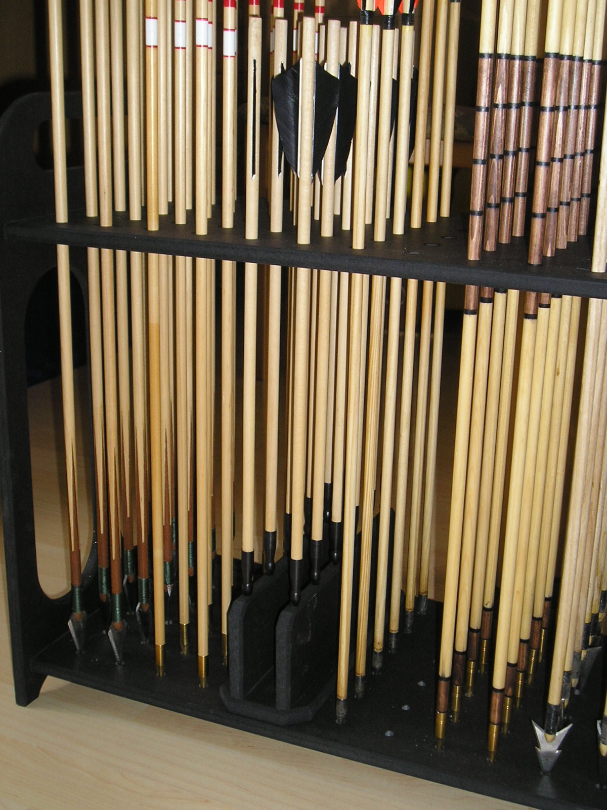 Ich wollte eine platzsparende Aufbewahrung für mein ganzes Bogenequipment. D.h. Bögen ( min. 4 ), Pfeile ( za. 25 - 30 ), Köcher, Handschuh, Armschutz, Pfeilzieher etc. und kein Möbelstück, das im Flur rumsteht