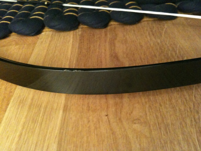 um für das Daumentechnik-Treffen (und während der Bauzeit eines Horn-und-Sehnen-Reiterbogens) trainieren zu können, habe ich mir den oben genannten Bogen geleistet. Heute erstmals probegeschossen, noch mit mediterraner Technik. Und dann, aua aua, zu Hause prompt auf den Kachelfußboden fallengelassen, so dass die rechte äußere Kante des oberen Wurfarmes diesen Kratzer abbekommen hat: Was meint Ihr, ist das problematisch? Wie könnte man die lackierte Oberfläche wieder "heilen"?