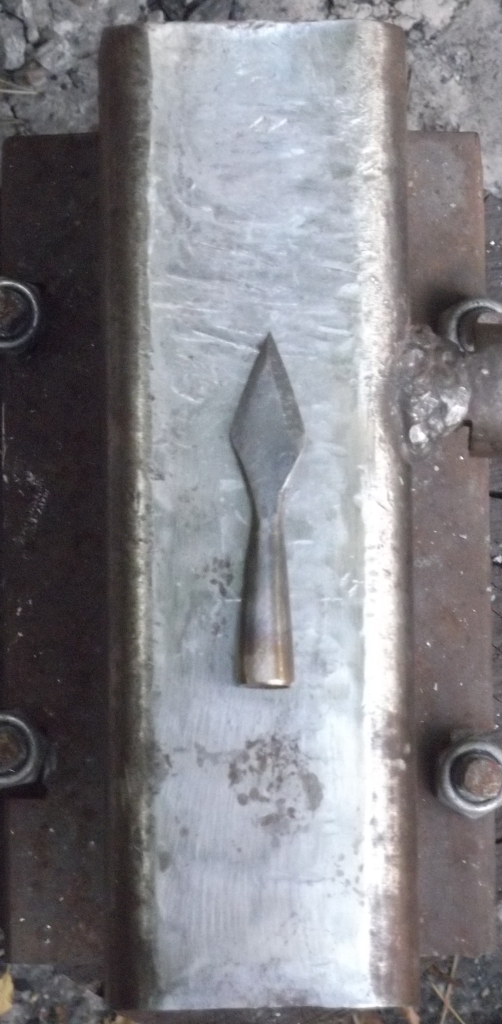 Die Außenschicht und speziell die Kanten mußten docch zwangsläufig härter sein, weil sie beim Schmieden mehr verdichtet werden! Und ich halte es schon für leicht realisierbar, die Spitze nach den letzten Schlägen in ein, neben dem Feuer stehendes, Wasserbehältniss zu tauchen,ohne wesentlich Zeit zu verlieren.