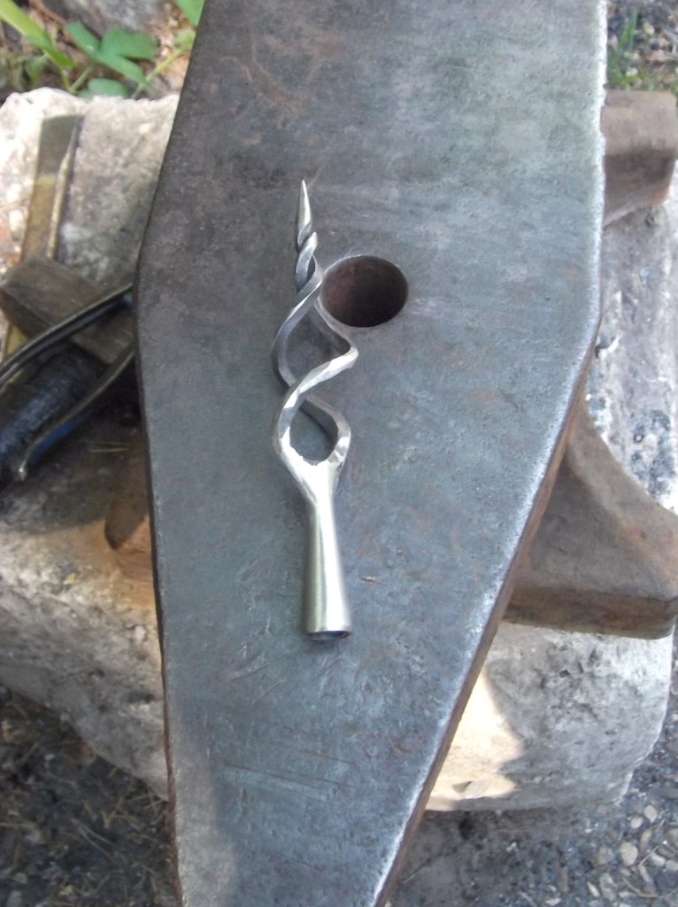 Wird doch wie bei den Zaun Verzierungen zwei schmale stäbe ausgeschmiedet nach vorne gebogen an der spitze zusammengeschmiedet Komplet erwärmt verdreht und beim zurückdrehen stellt es sich so birnenförmig auf