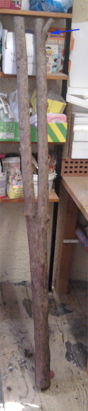 So sa der Stamm aus; der gebrochene Ast wurde mit einem Pfeil markiert. Das Ding wurde gespalten, sodass ich noch den "guten, schönen" Stave habe, wärend ich den "schlechten, astigen" erst mal zum Üben und Eibenkennenlernen gebraucht und gebrochen habe. Giannis "beste Lösung" wird also definitif noch ausgeführt ;)