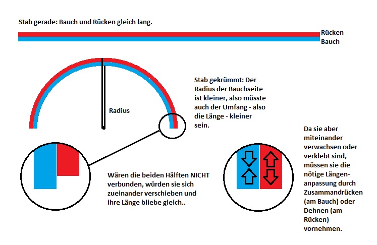 1. Bei einem gekrümmten Stab entsteht auf der Bauchseite Druck, auf der Rückenseite Zug. Das hat damit zu tun, dass der Radius an der Bauchseite kleiner ist als am Rücken, weil der Rücken vom gemeinsamen Kreis-Mittelpunkt einen größeren Abstand hat: