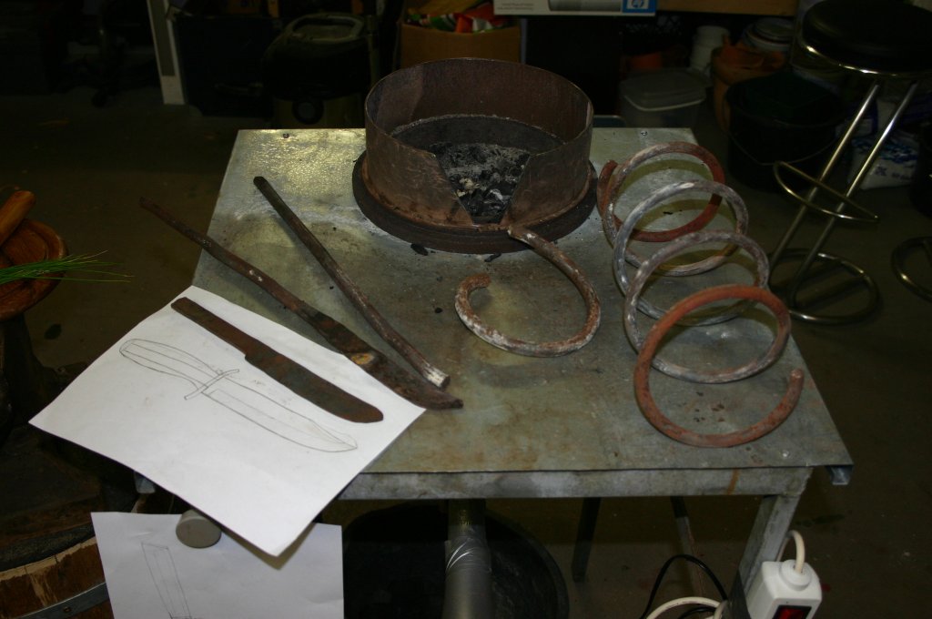 ein Foto zeigt neben meiner Esse die Evolutionsschritte von der Autofeder zum Klingenrohling. Ich versuche eigendlich immer beim Schmieden einer Klinge zumindest auch einen Rohling für den nächsten Versuch mit herzustellen. ( Wenn man das Feuer schon mal an hat ...)