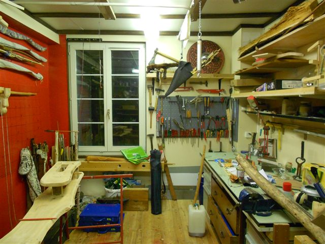 Meine Werkstatt ist eigentlich mein Keller und der lag bis vor drei Monaten noch brusthoch völlig randomisiert voller Umzugssediment von vor vier Jahren. Aber weil ich irgendwann ein Bogenbauer sein will, hatte ich endlich einen Grund, ihn aufzuräumen. Leider liegt er genau unter dem Schlafzimmer meiner Nachbarn, da muß ich mich ein bißchen an die Zeiten halten.
