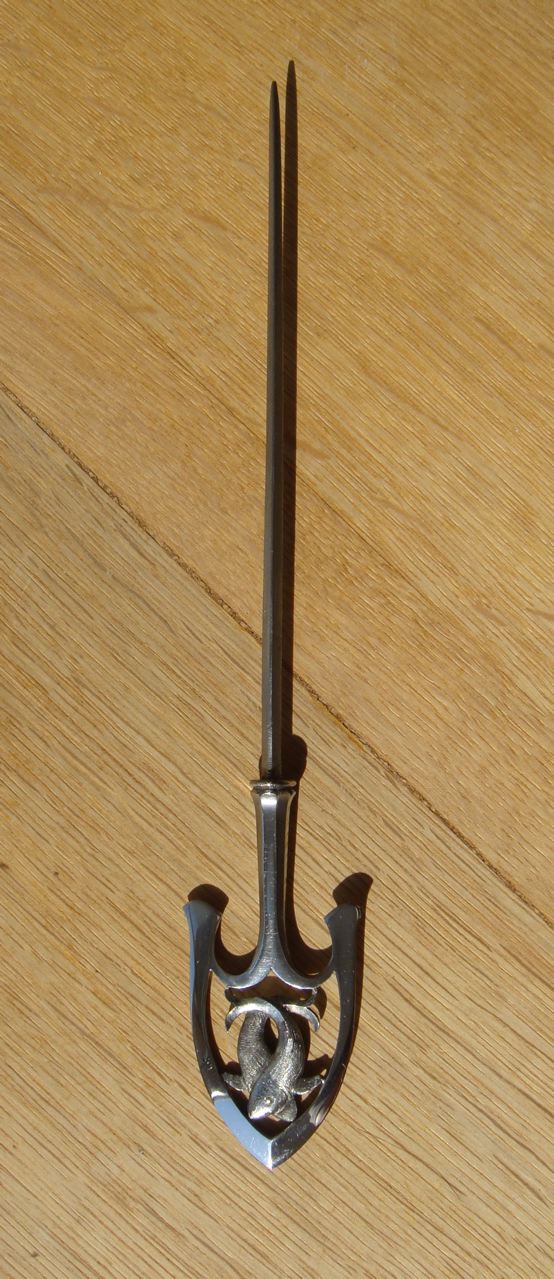 Die Form wurde grob ausgeschmiedet - zu grob leider - am Hals der Spitze zeigen sich zwei Macken, da hatte ich das Metall gefaltet und schlecht verschweisst... naja, irgenwas ist halt immer...