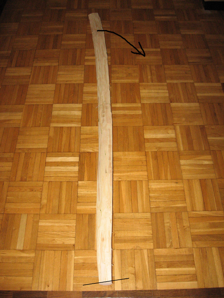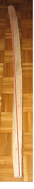 Geplant ist ein Langbogen mit ca 35lbs bei 27" Auszug. Da der Stave über die ganze Länge eine Biegung aufweist, bin ich mir nicht sicher ob sich die gewünschte Länge umsetzen lässt, oder ob ich den Rohling kürzen soll. Beim Prüfen des Sehnenverlaufs entfernt sich die Richtschnur in der Mitte doch ziemlich weit von der realen Mitte des Staves.